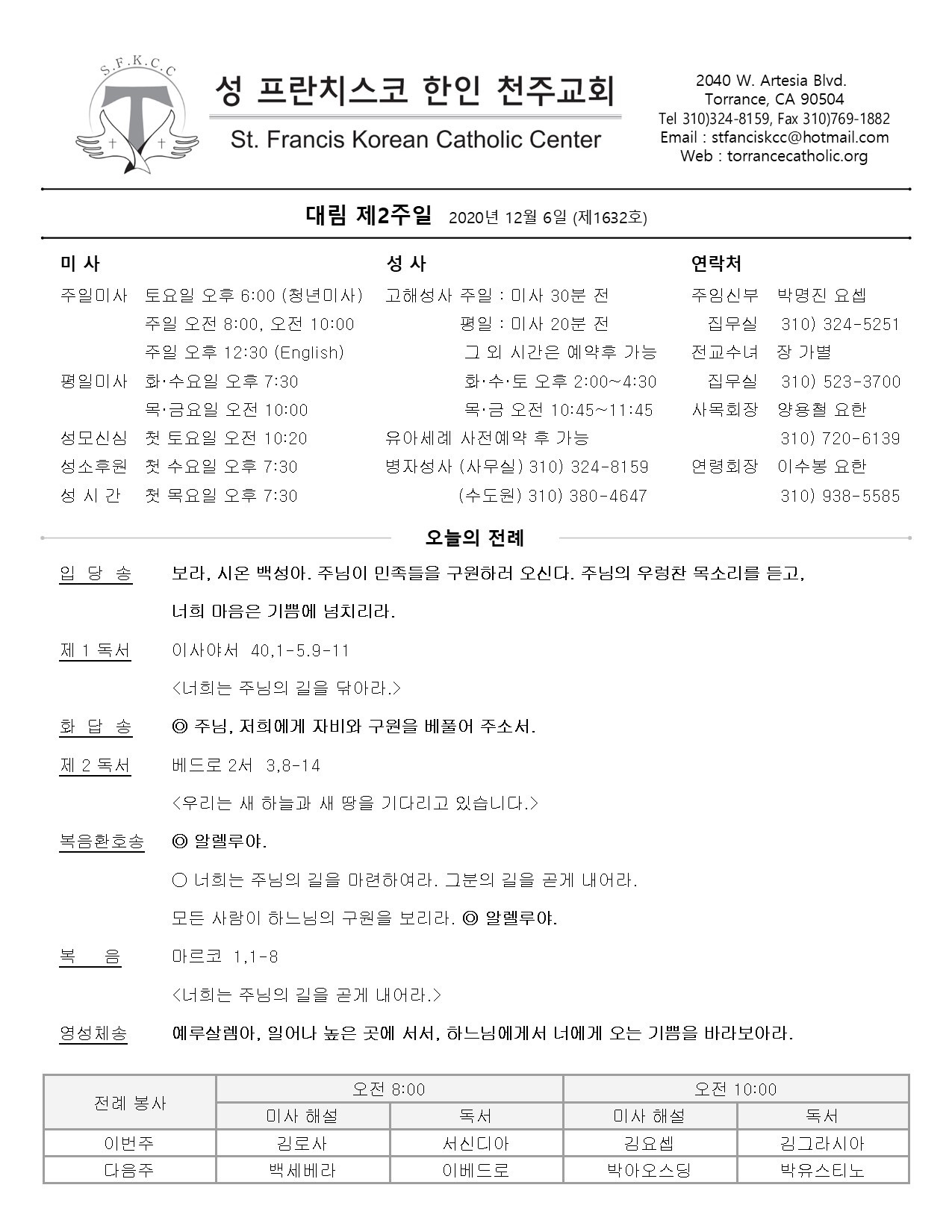 주일: 오전 8시; 10시 (한국어)