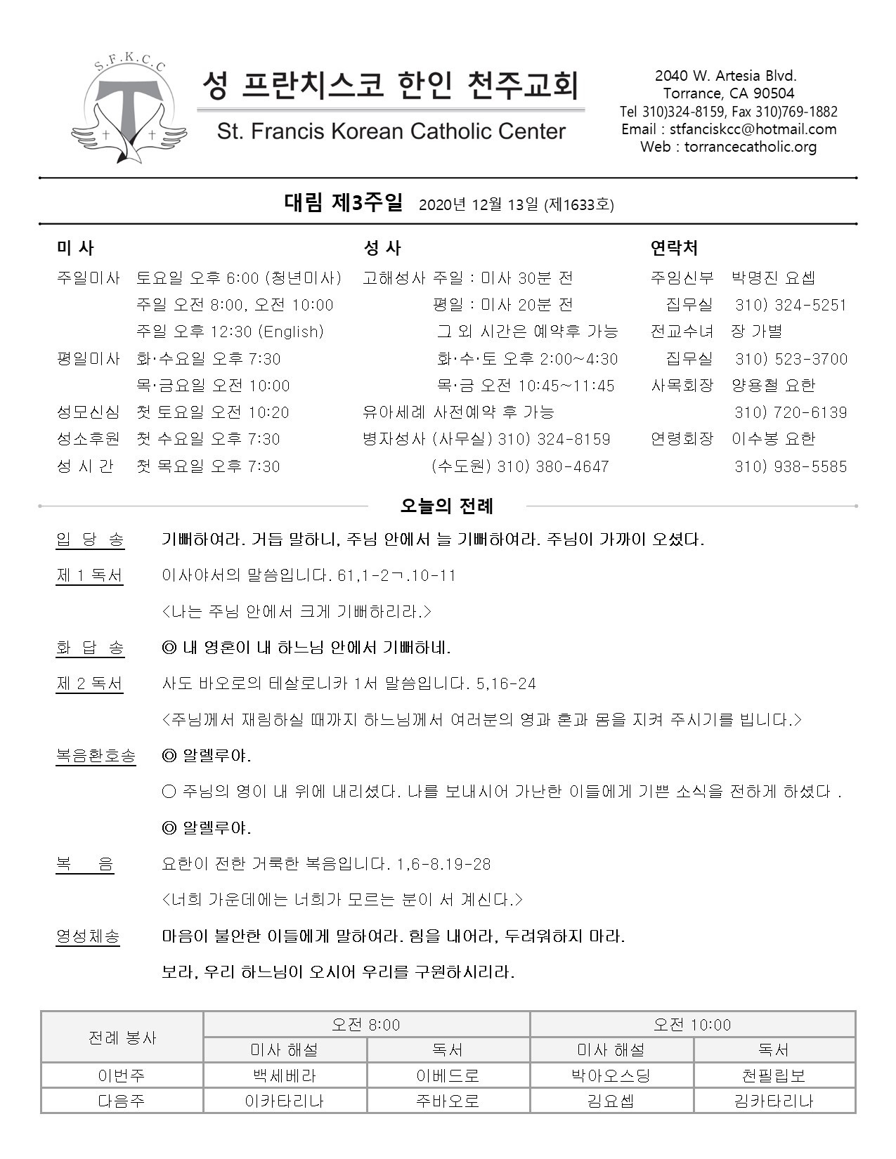 주일: 오전 8시; 10시 (한국어)