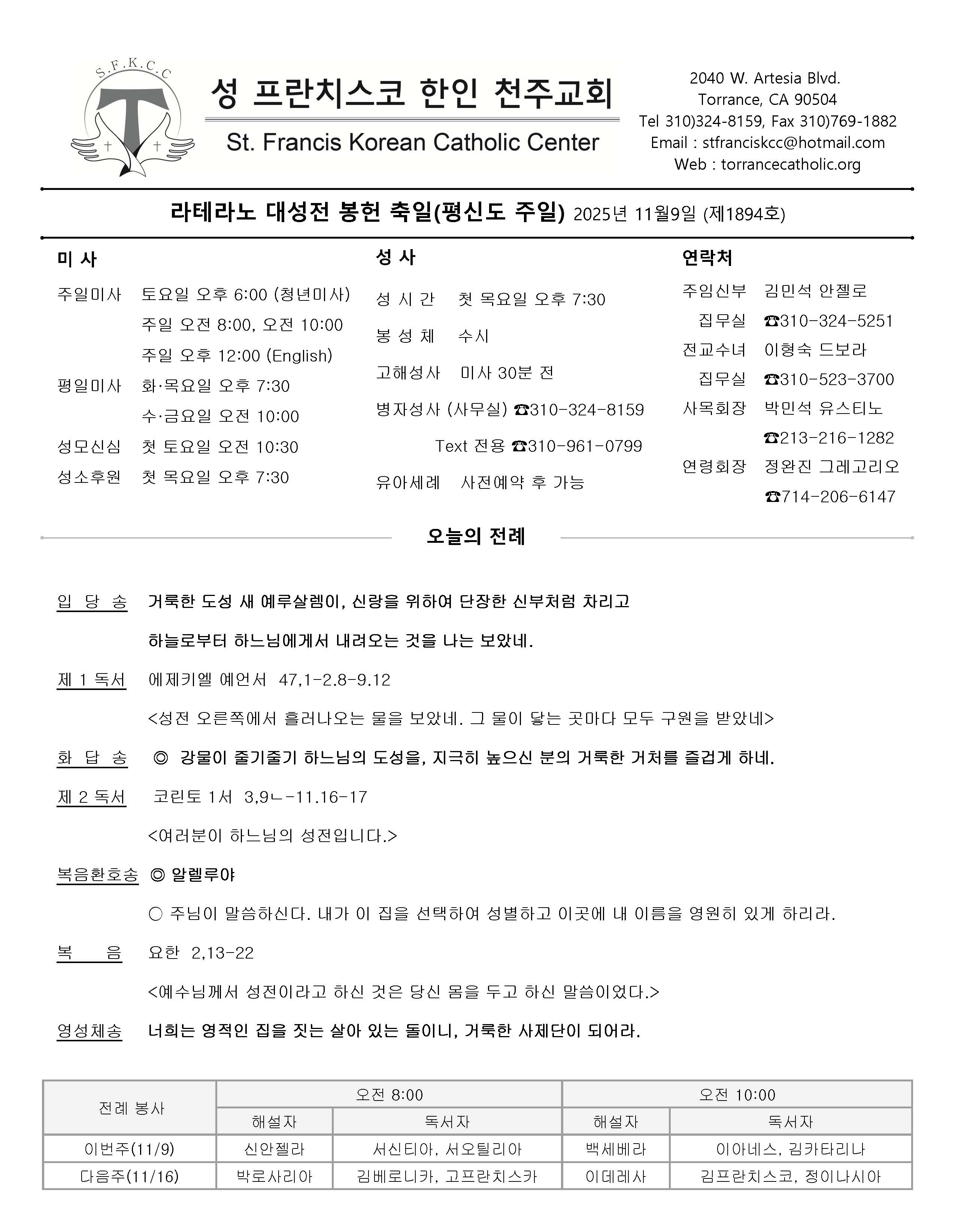 주일: 오전 8시; 10시 (한국어)