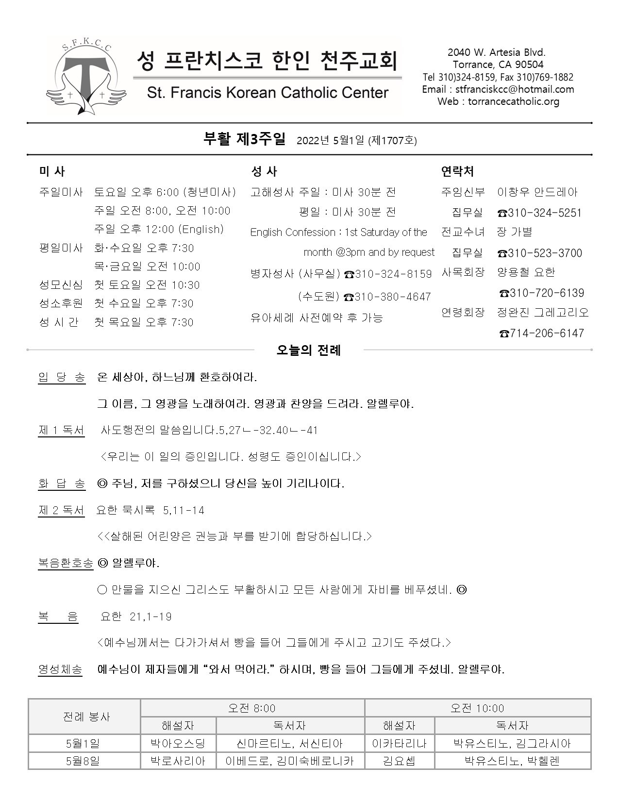 주일: 오전 8시; 10시 (한국어)