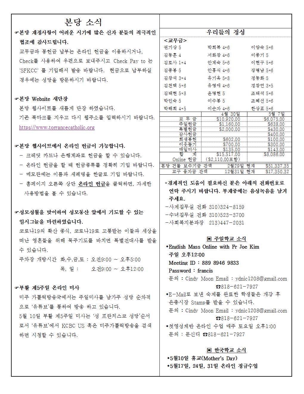 주일: 오전 8시; 10시 (한국어)