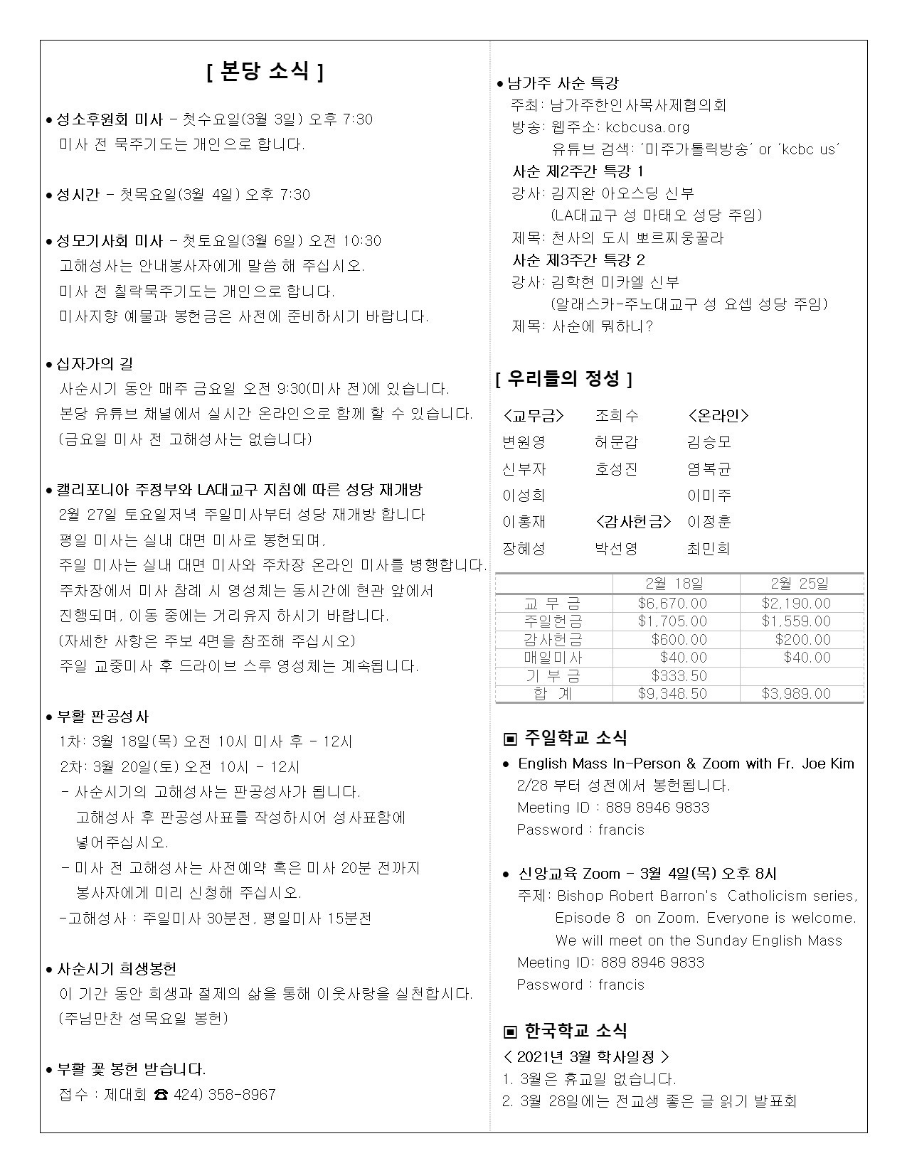 주일: 오전 8시; 10시 (한국어)
