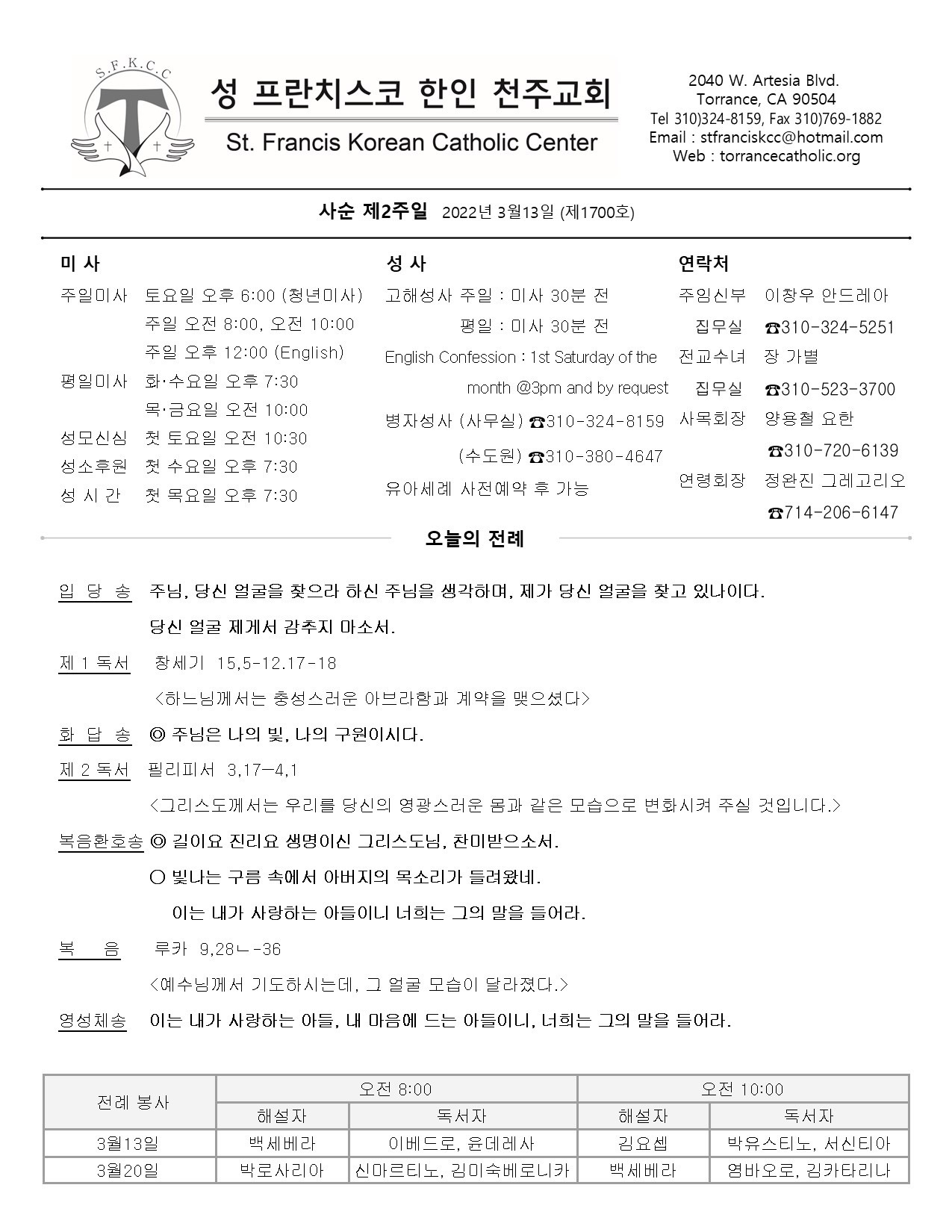 주일: 오전 8시; 10시 (한국어)