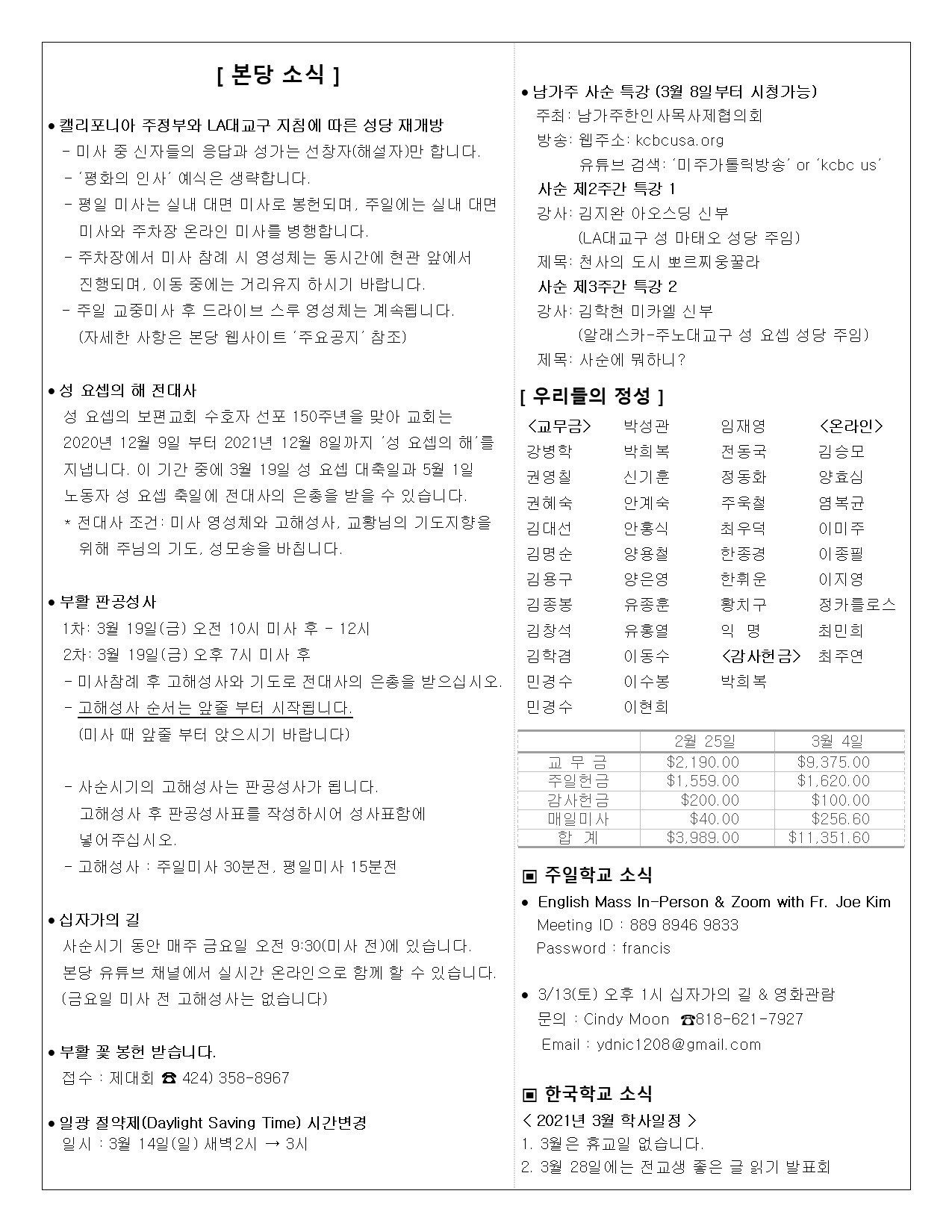 주일: 오전 8시; 10시 (한국어)