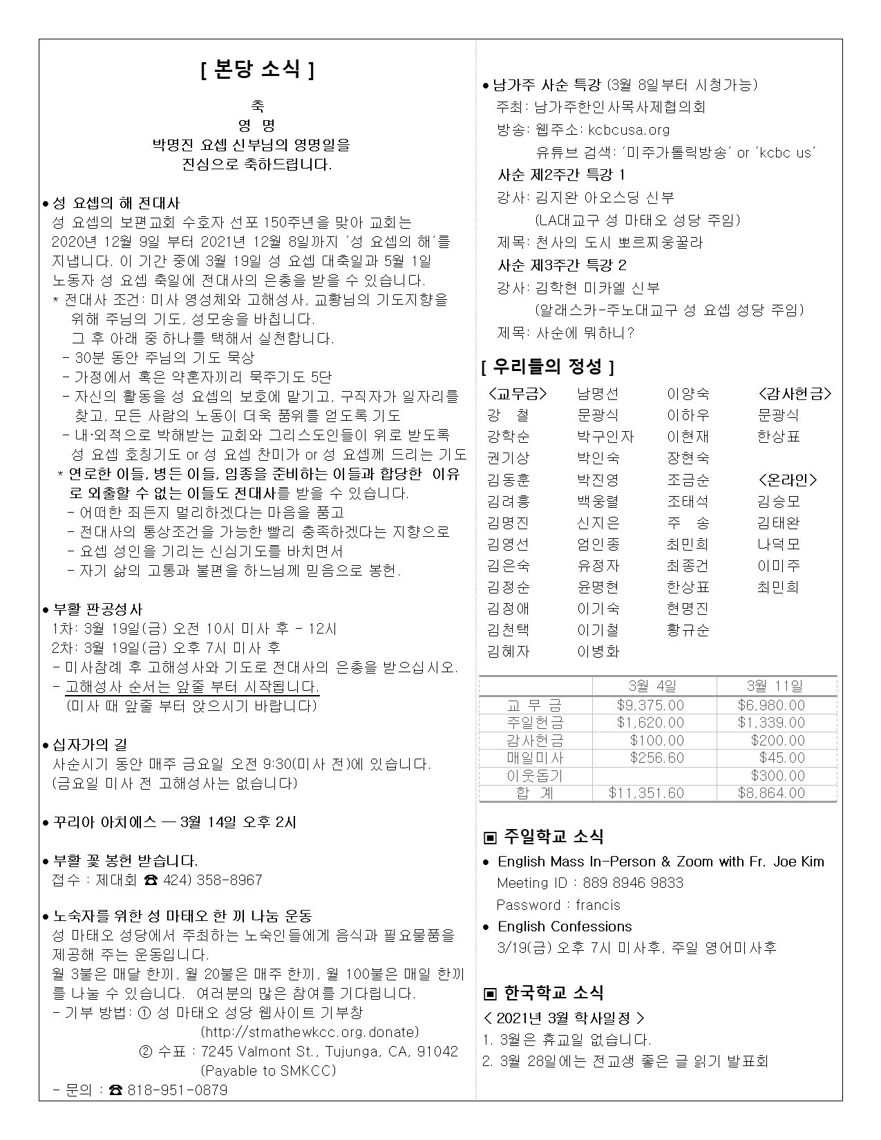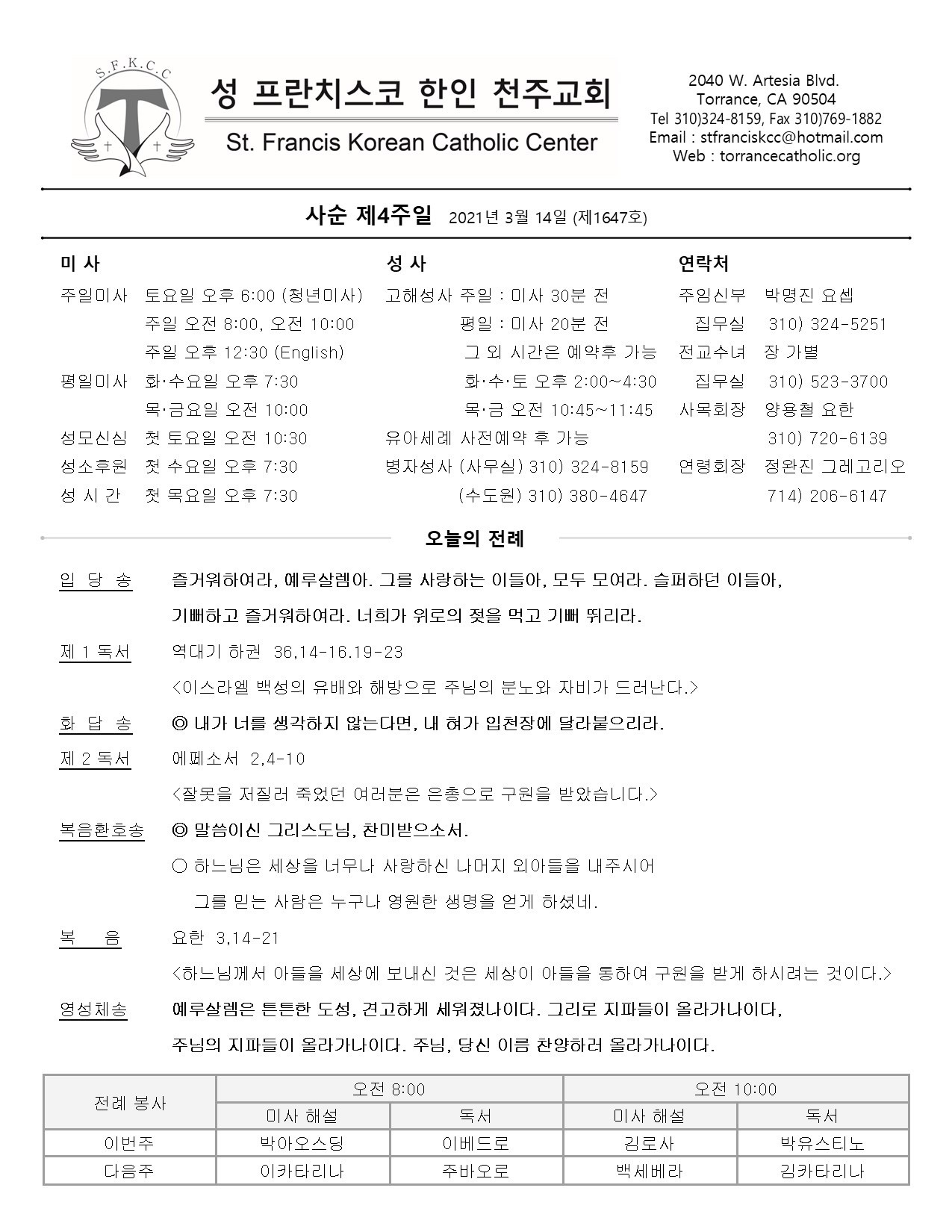 주일: 오전 8시; 10시 (한국어)