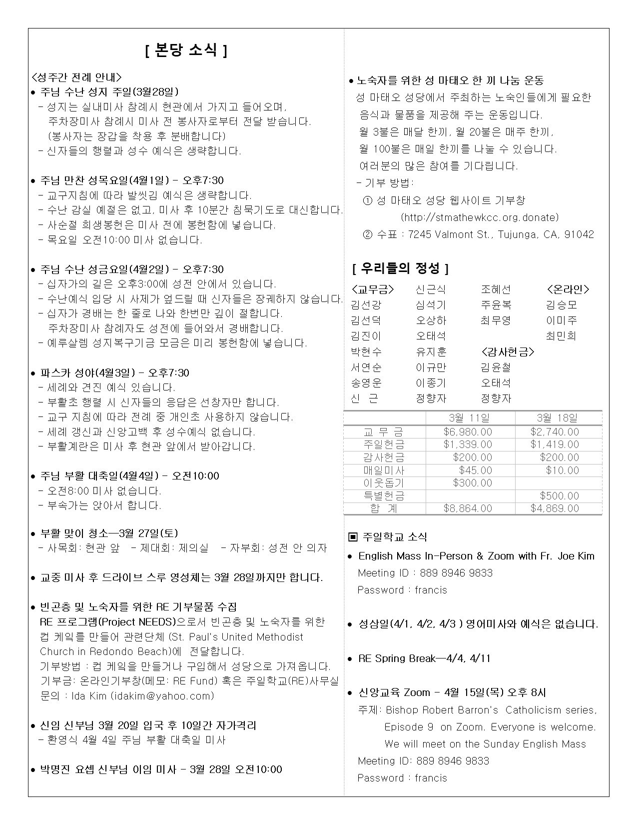 주일: 오전 8시; 10시 (한국어)