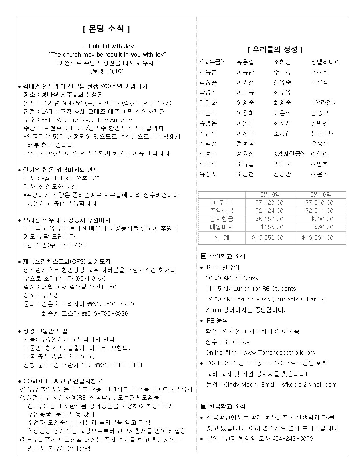 주일: 오전 8시; 10시 (한국어)