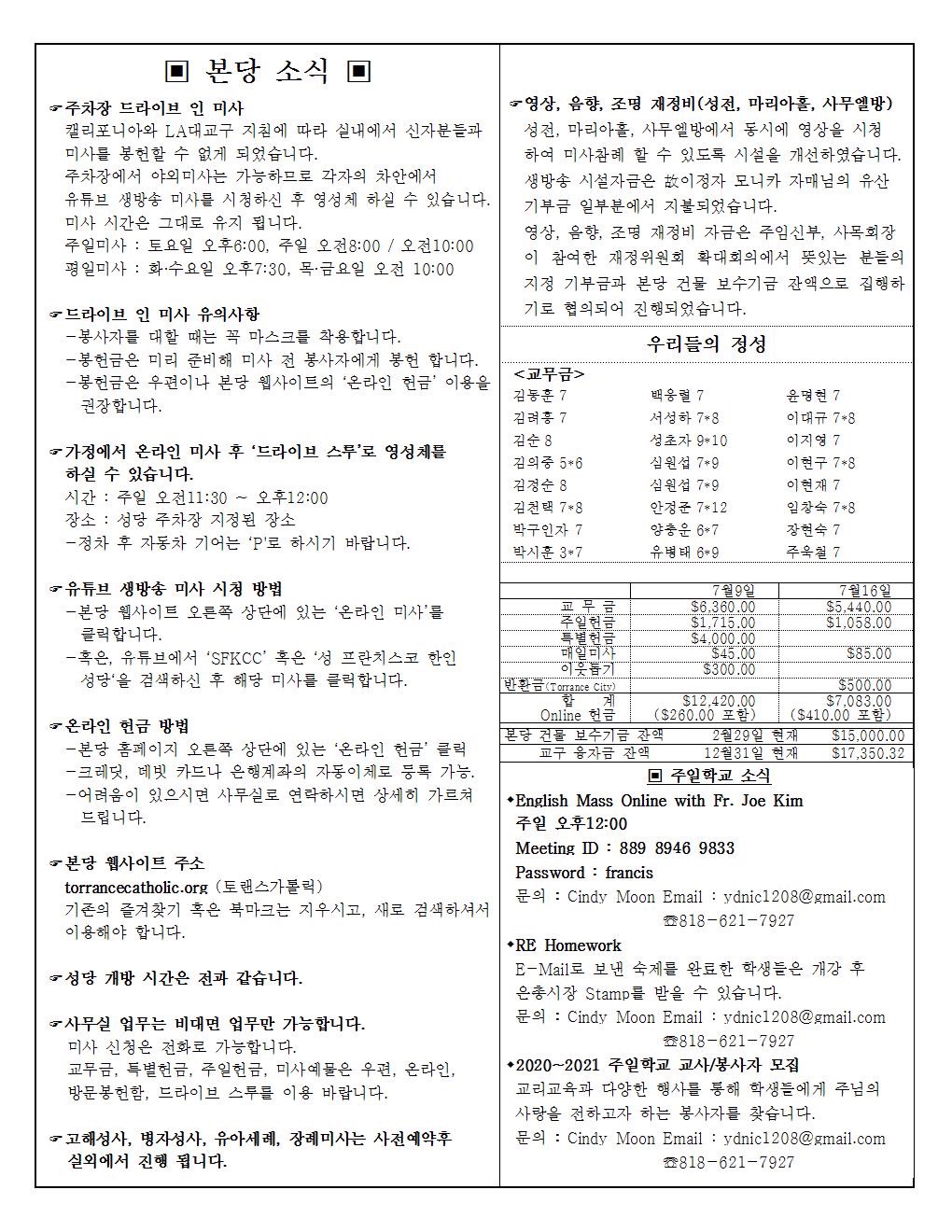 주일: 오전 8시; 10시 (한국어)