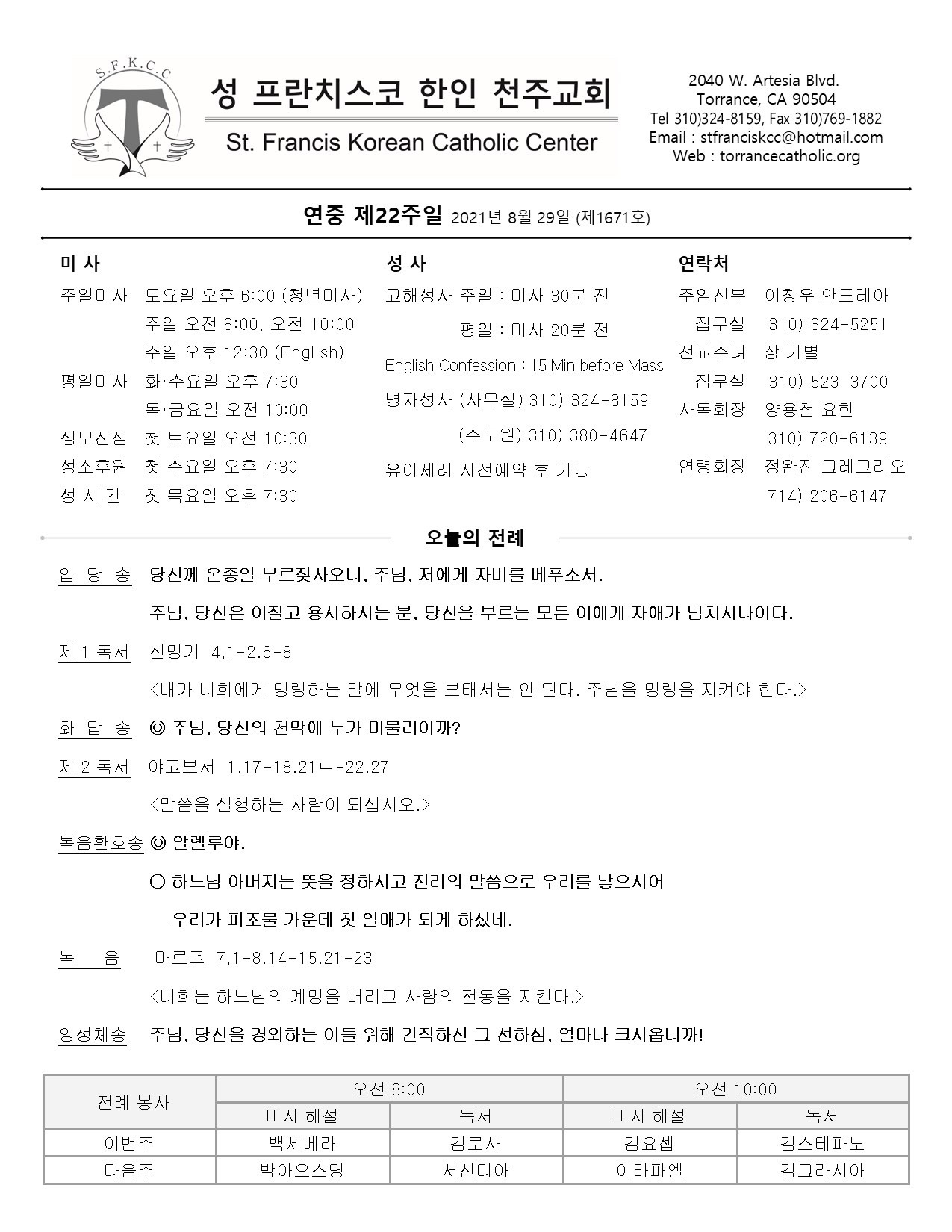 주일: 오전 8시; 10시 (한국어)