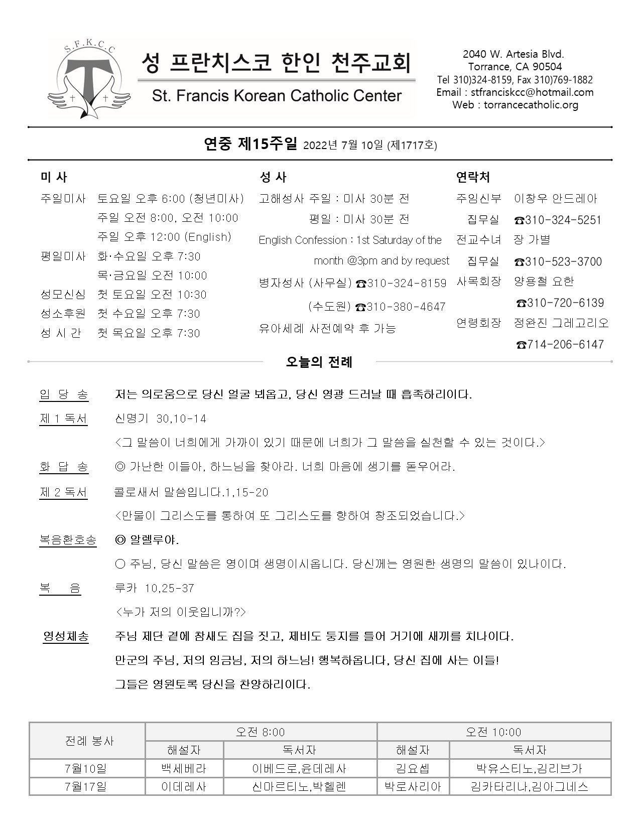 주일: 오전 8시; 10시 (한국어)