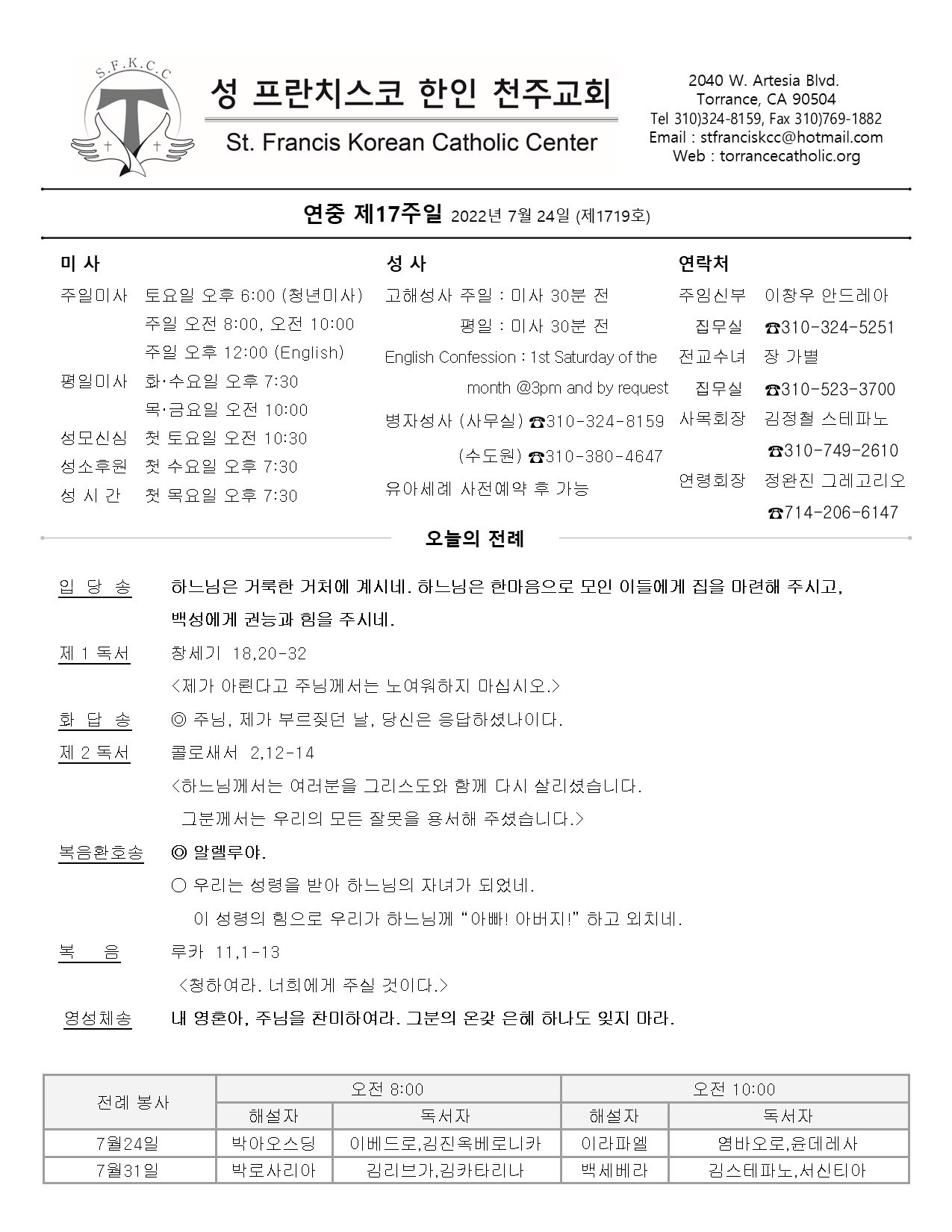 주일: 오전 8시; 10시 (한국어)