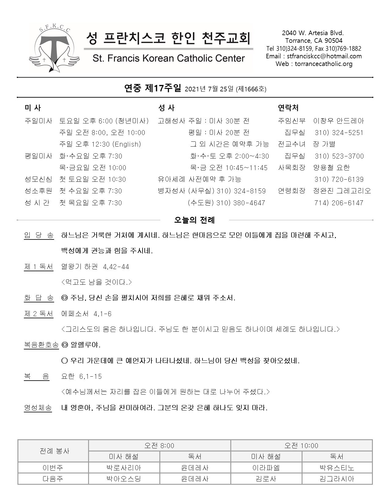주일: 오전 8시; 10시 (한국어)