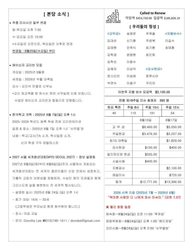 주일: 오전 8시; 10시 (한국어)