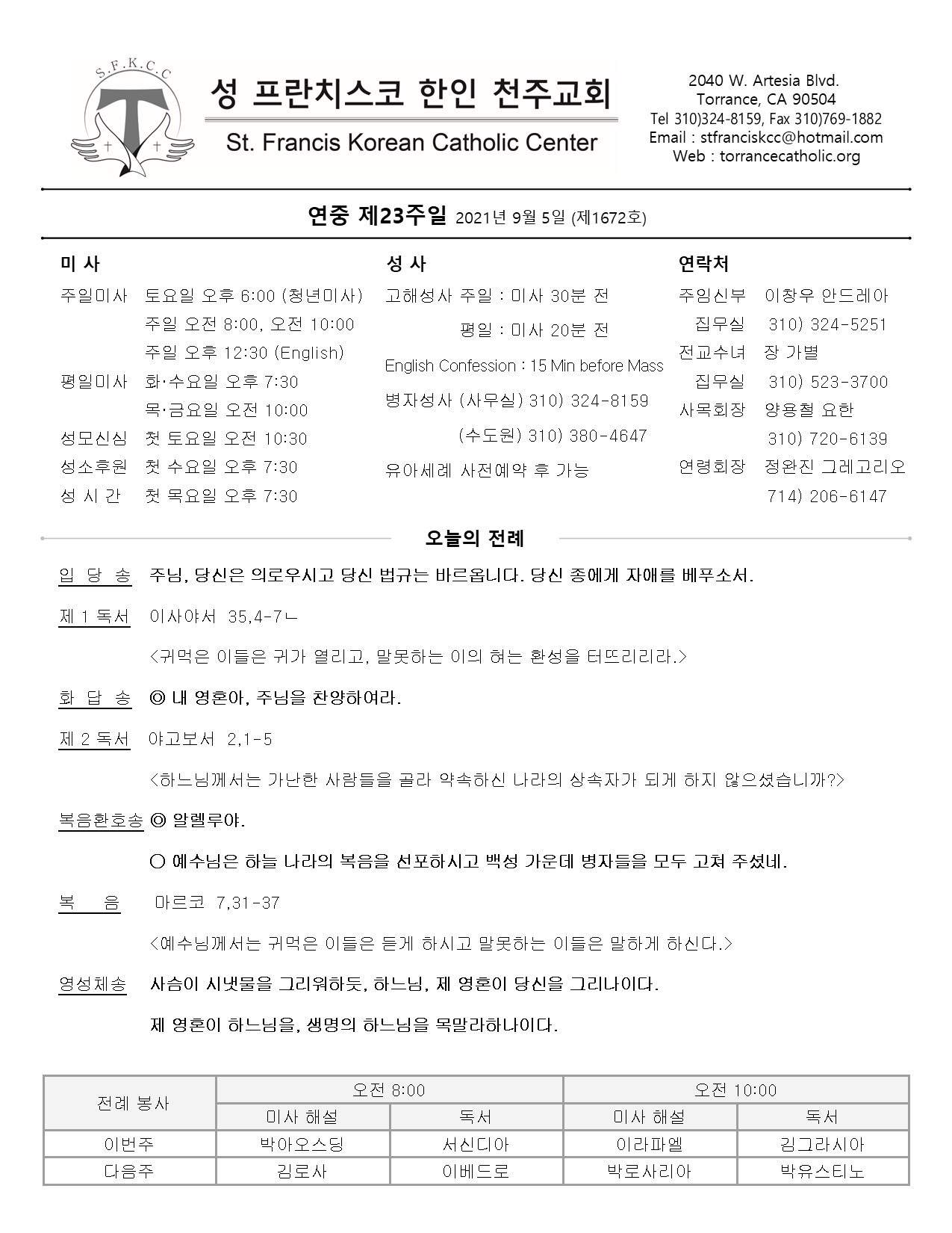 주일: 오전 8시; 10시 (한국어)