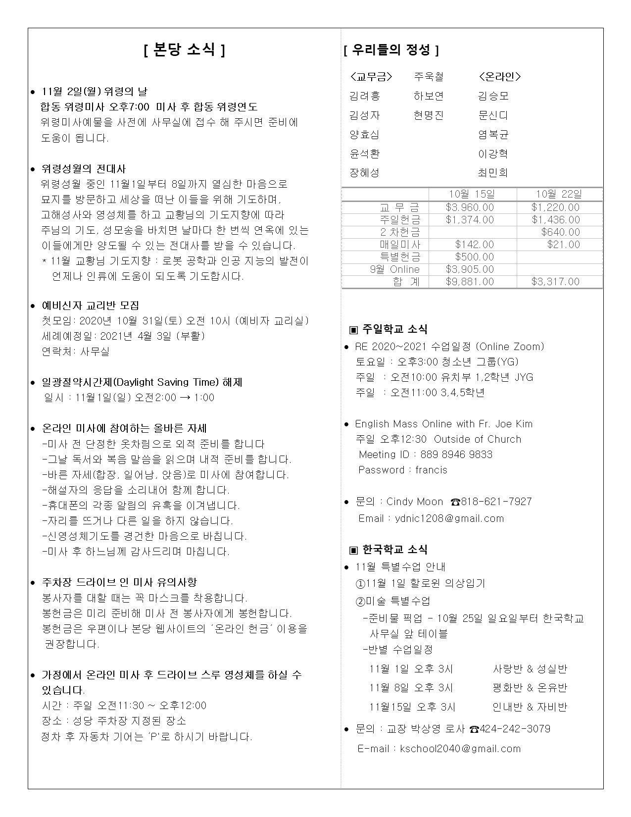 주일: 오전 8시; 10시 (한국어)