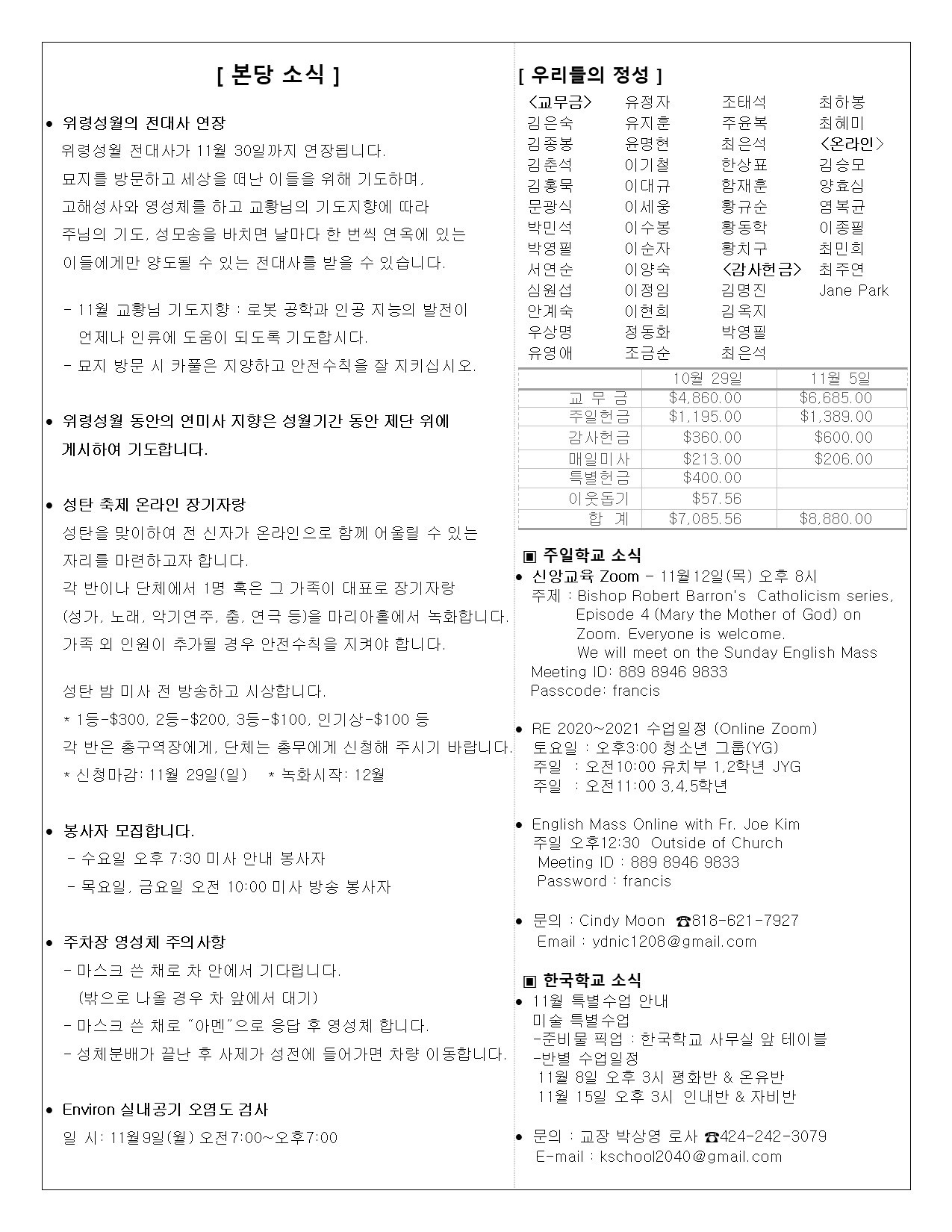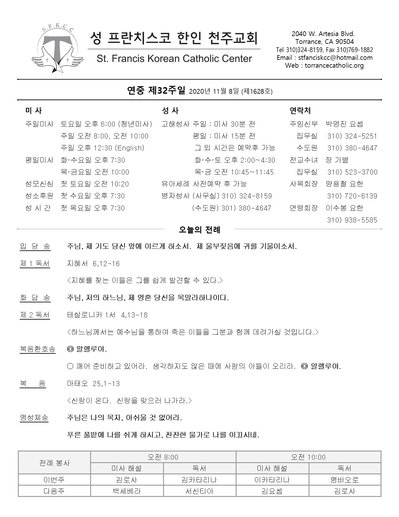 주일: 오전 8시; 10시 (한국어)