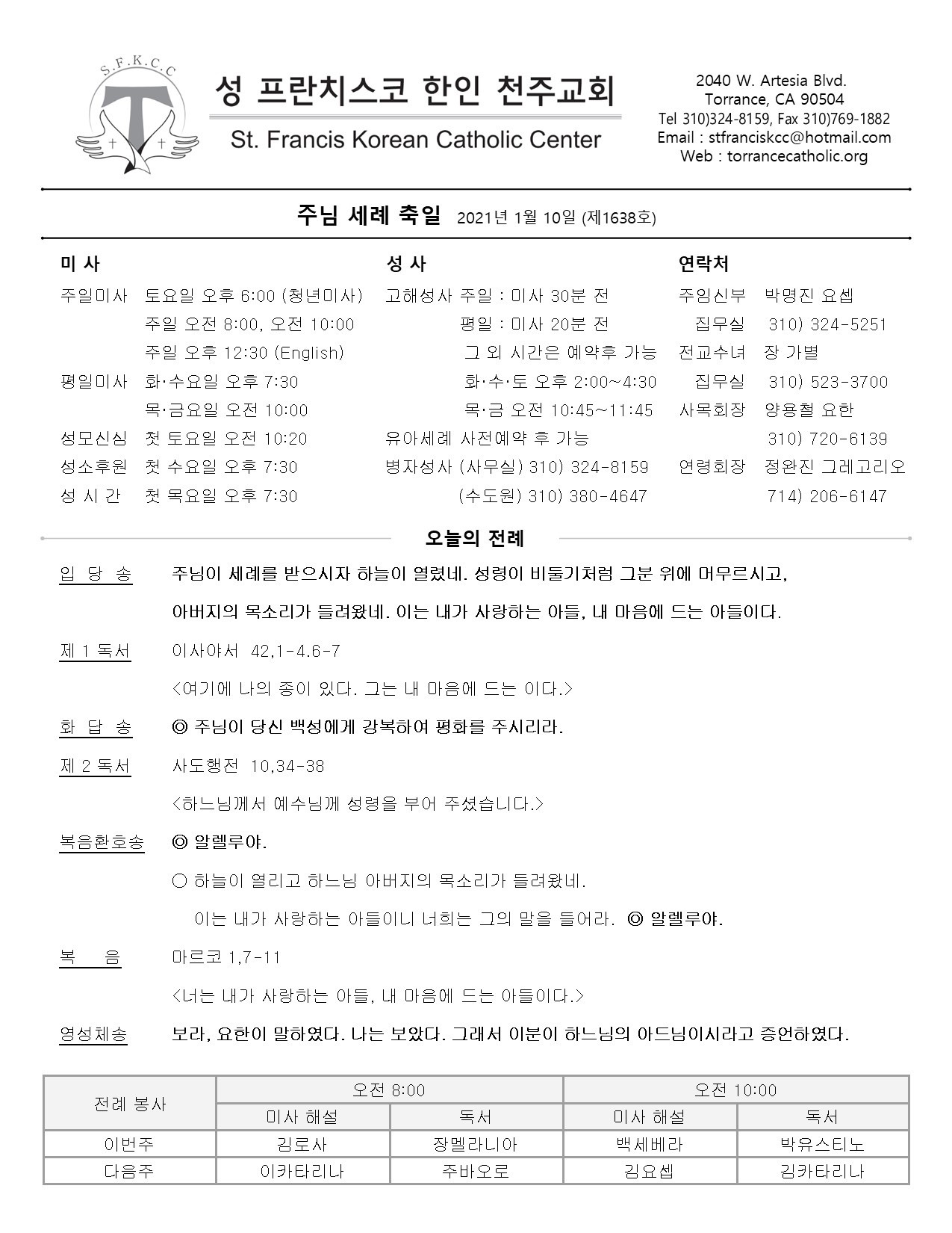 주일: 오전 8시; 10시 (한국어)