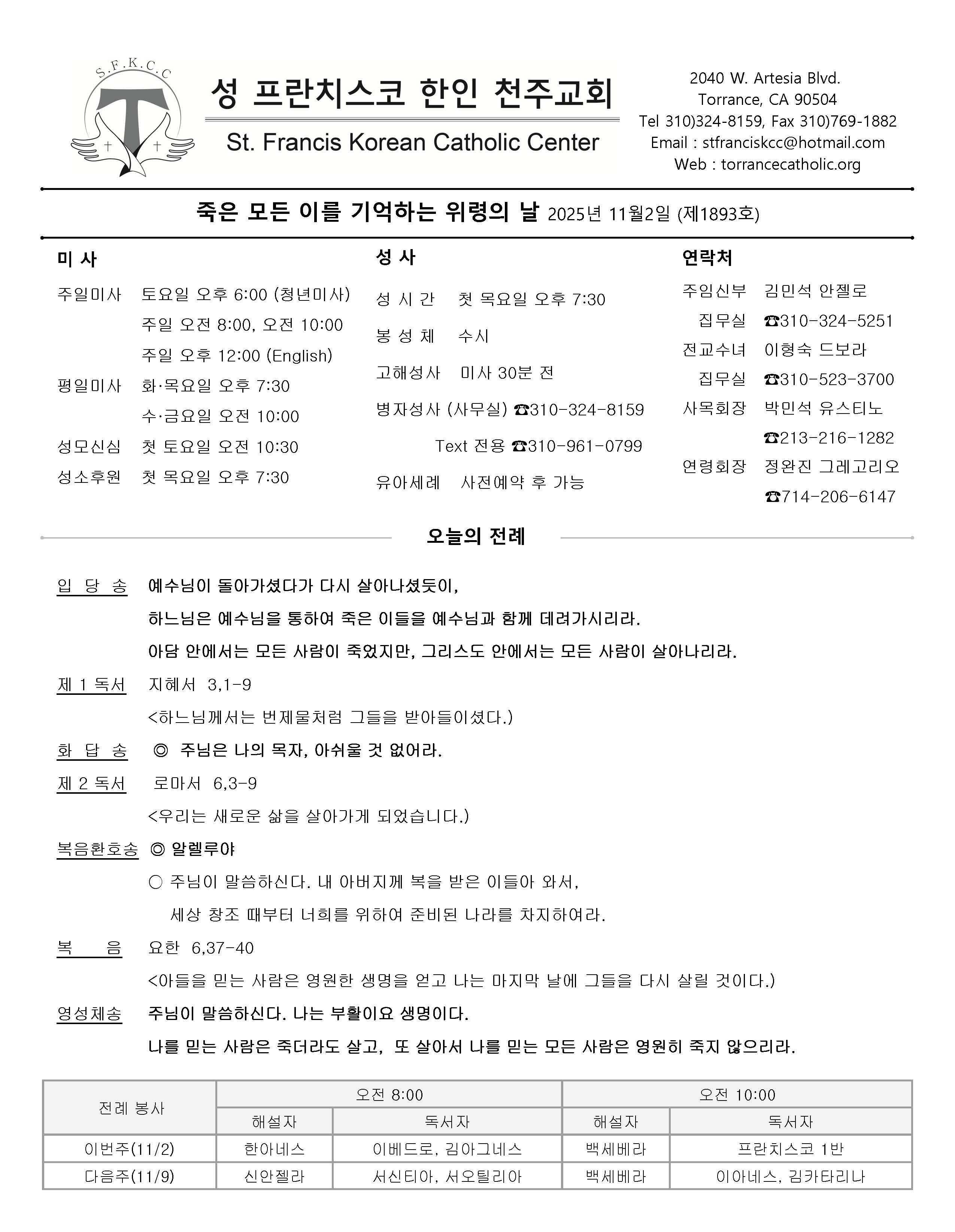 주일: 오전 8시; 10시 (한국어)